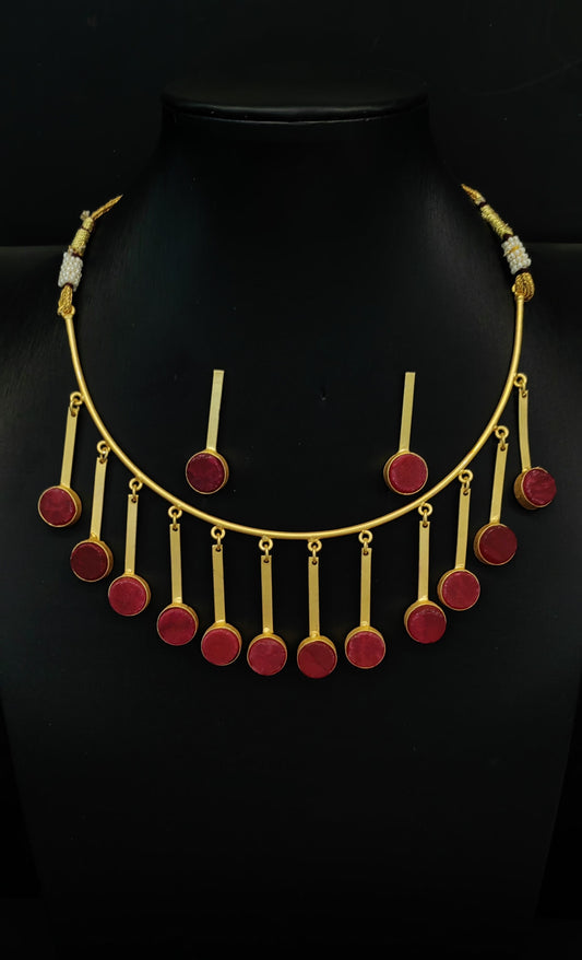 Hanging Brass Red Sea Stone Necklace in Gold Finish with Earrings