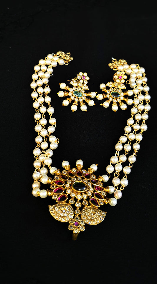 Hanging Brass Pearl Necklace in Gold Finish with Earrings