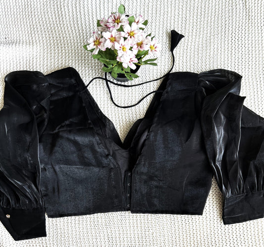 Exquisite Net Blouse with Golden Lace Work and Pleated Sleeves