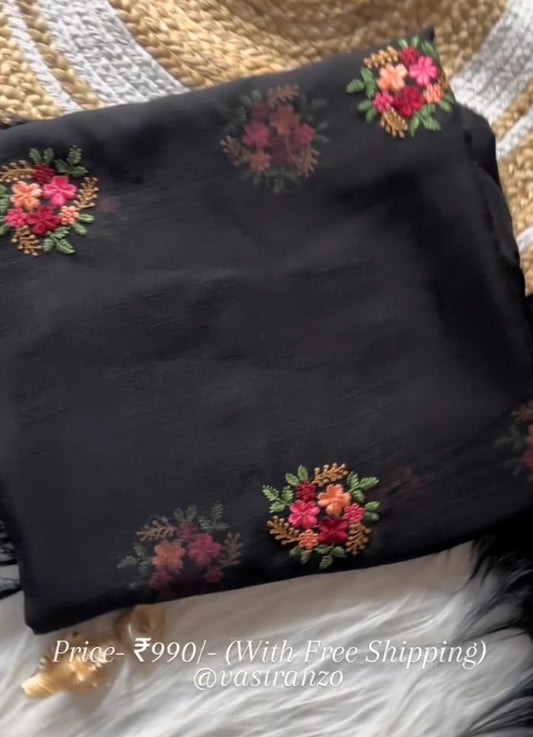 Beautiful Chiffon Multi Thread Embroidery Work Sarees In Black