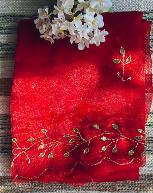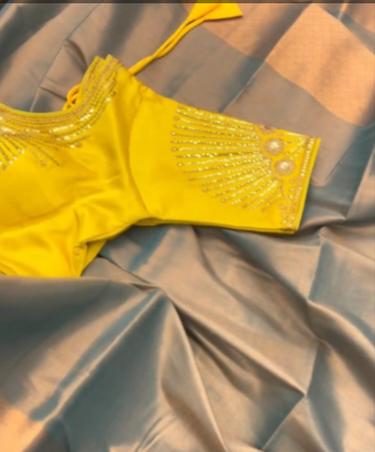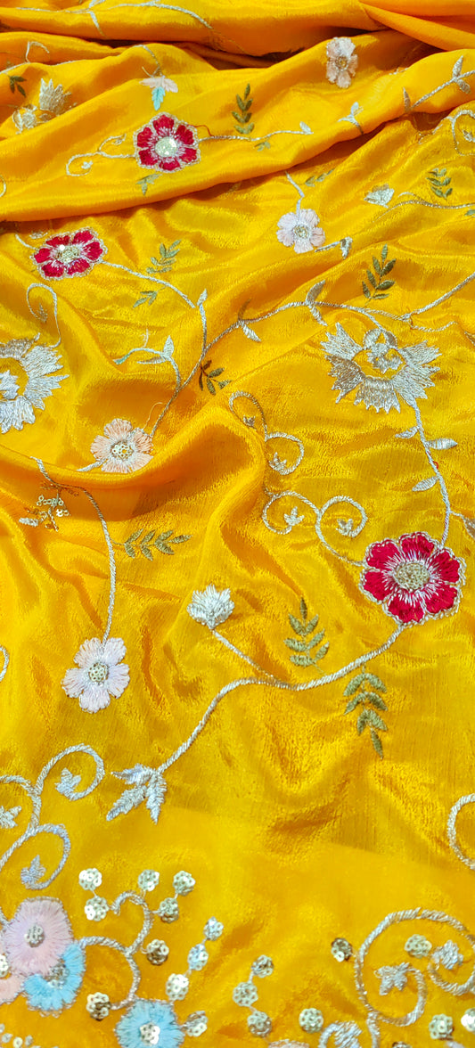 Beautiful Turmeric Yellow Soft Silk Chinon Embroidery and Sequence Work Saree,