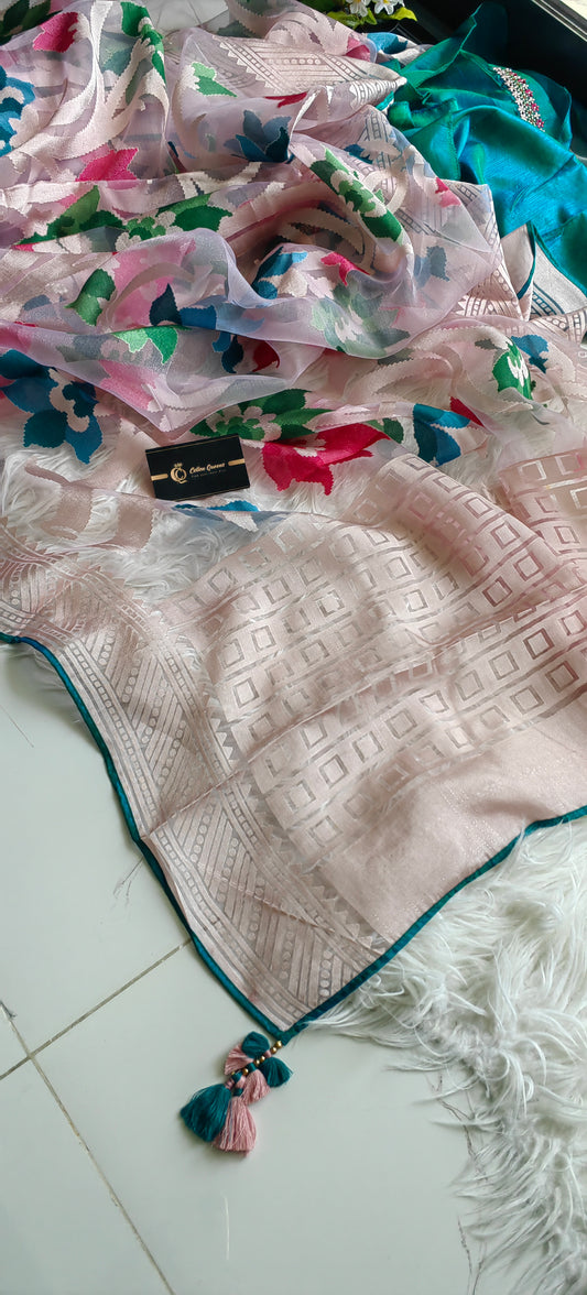 Baby pink Kanjivaram silk Saree with contras Sky Blue Boarder and pallu