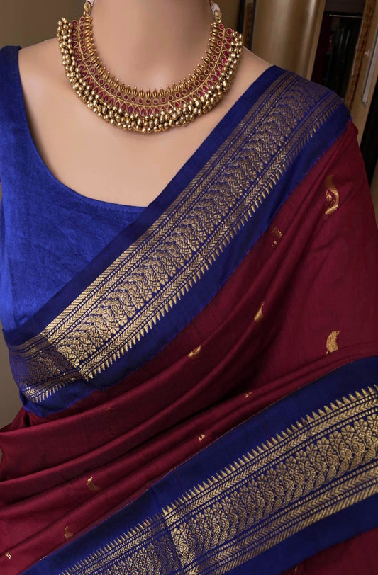 Peacock Splendor: Reddish Maroon Cotton Silk Saree With Blue golden peacock Border