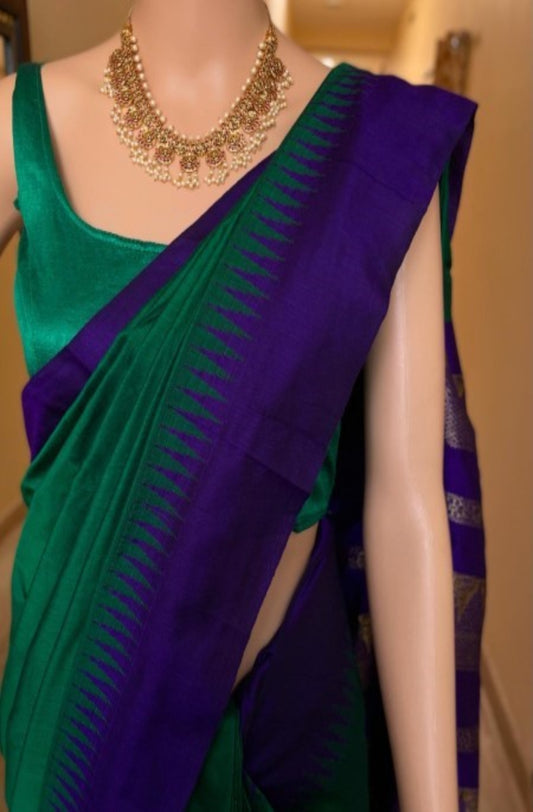 Temple Saree: Forest Green Silk Cotton Saree With Violet Temple Border