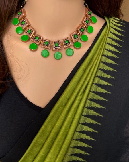 Temple Saree: Parrot Green Silk Cotton Saree With Black Temple Border