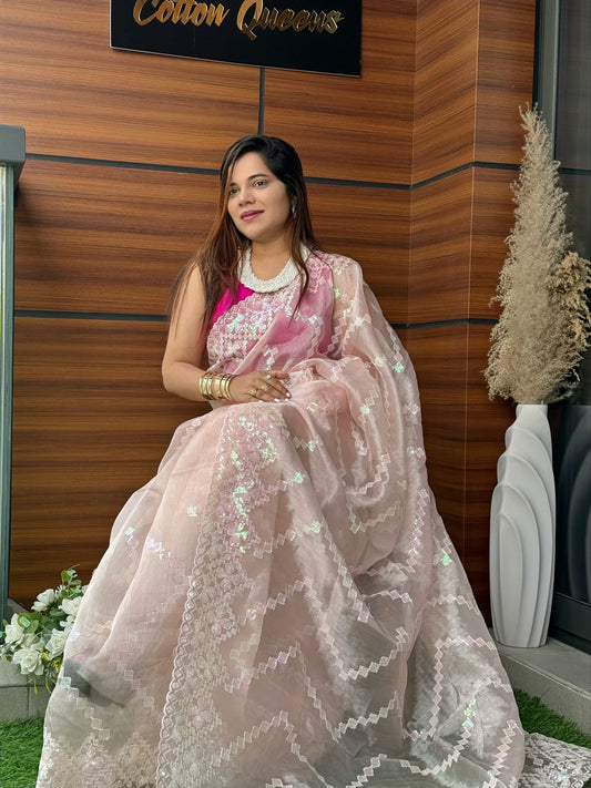 Zig Zac Sequin Organza saree in pink Color