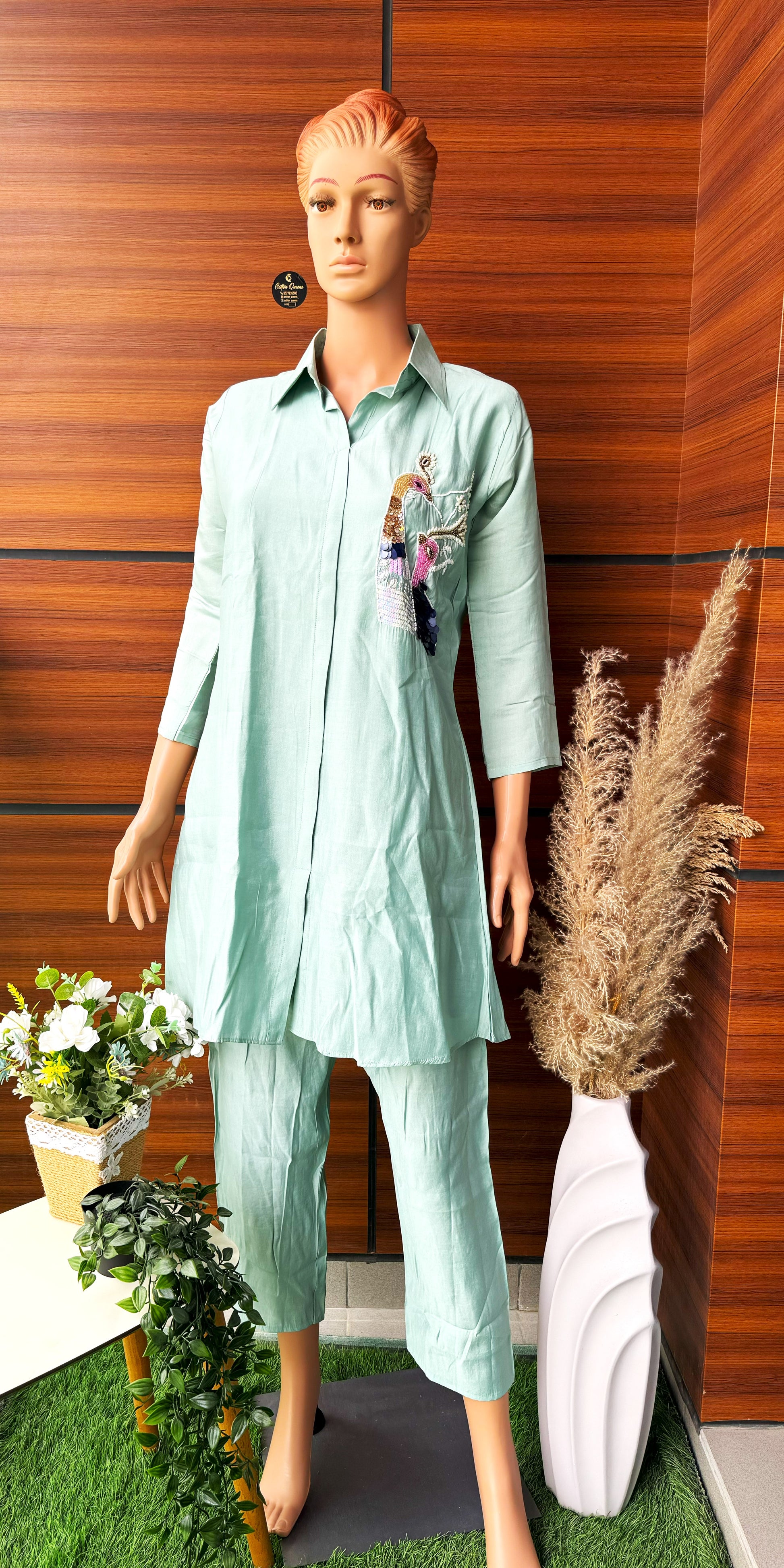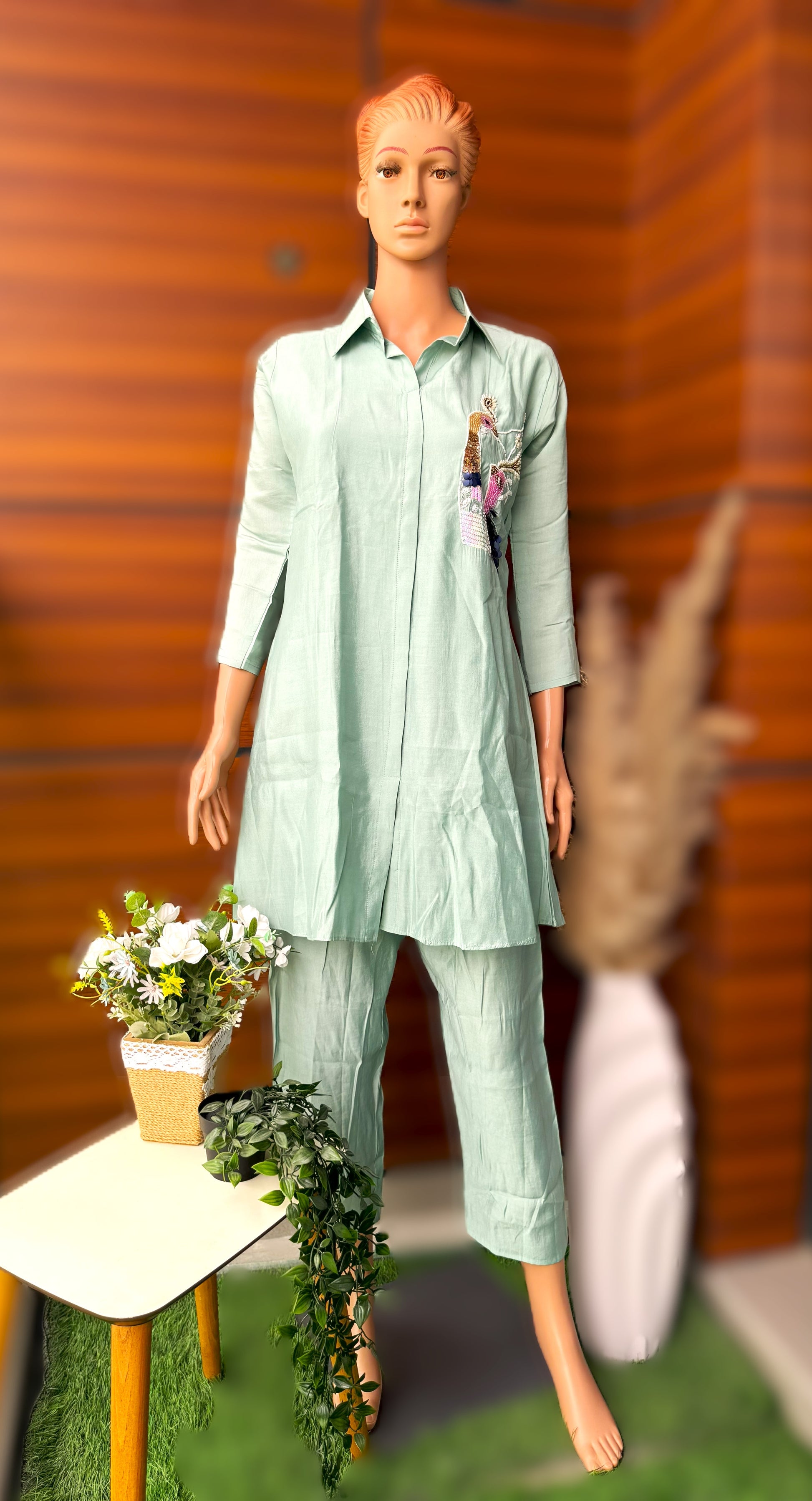 Handcrafted Peacock Perfection Summer Co-ord Set in pastel Pistachio color